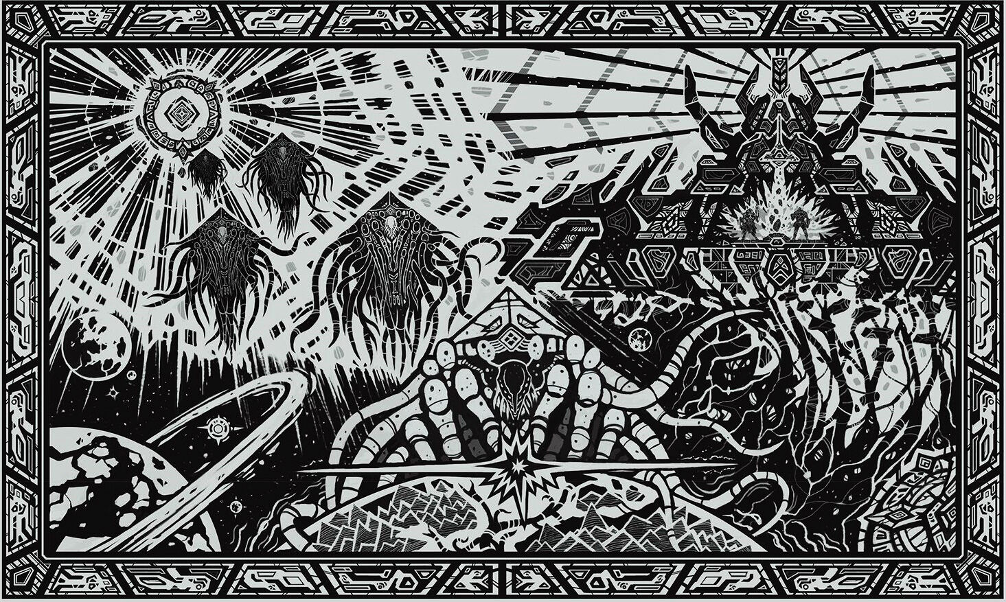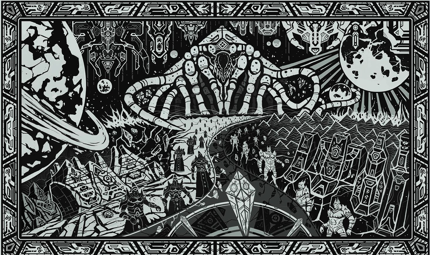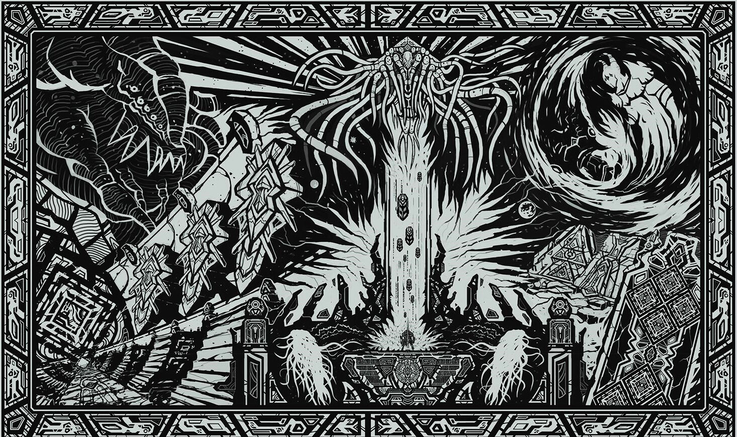 Huge spooky shadow guy on the left. Maybe a drop pod or induction… Is that inside the ship on the left? Top right is two guys, light and shadow in ying yang. Could be people returning after the purge. New life for each unknown cycle, could beam into the core of the world.