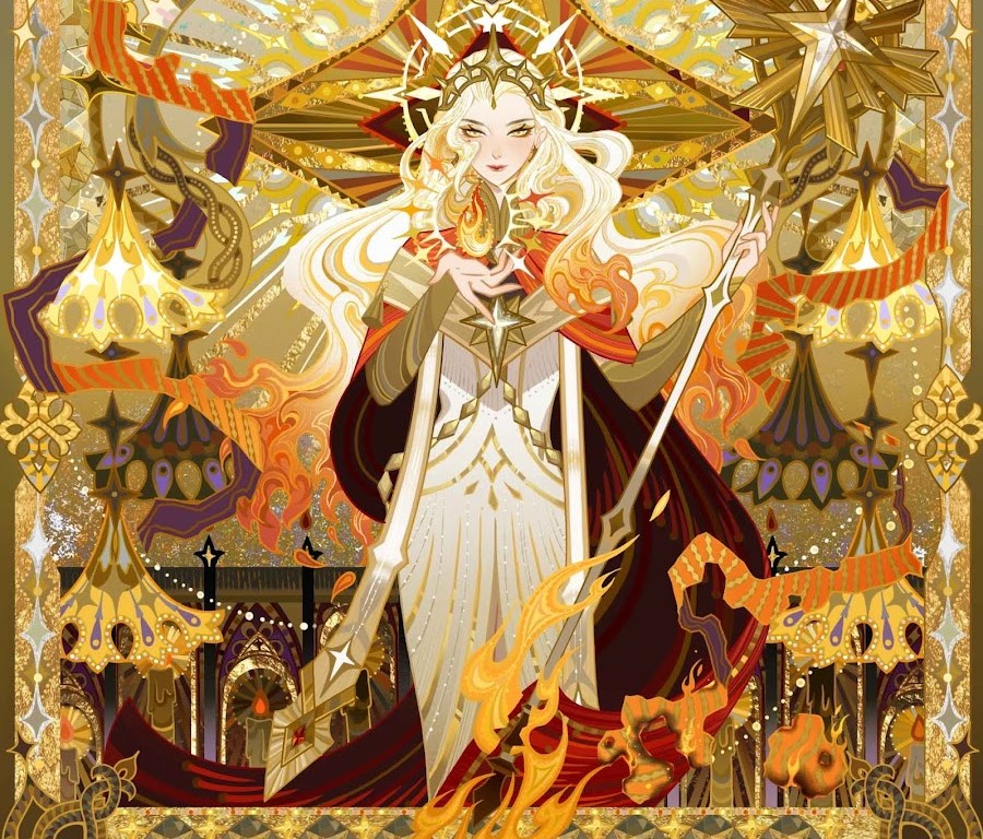 The Goddess of Light, whose domains also include Peace and Solidarity. She is the leader of the Dawnborn pantheon of Gods. She has been absent from the world for a long time while attending to the wound in reality deep within Inodan. In her absence, the world’s state has slowly decayed and she attributes this to her lack of presence personally in Rose goes to Inodan.